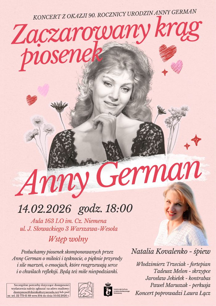 Najbliższe koncerty: Już 14 lutego 2026 r w Warszawa Wesoła „Zaczarowany krąg piosenek Anny German” Piosenki o miłości i samotności, oczarowaniu życiem i odzyskaniu uczuć, pięknie przyrody i marzeniach, o gorących emocjach i takie które skłaniają do refleksji! Tym niezwykłym koncertem pragniemy zaprezentować, przypomnieć a dla kogoś może odkryć piosenki, muzykę do których napisała Anna German. Chcemy przypomnieć publiczności, że miała także niezwykły talent kompozytorski. Inspiracją do stworzenia programu koncertu został zbiór nut “Zaczarowany krąg” wydany w 1971 roku który zawiera nuty piosenek skomponowanych przez Annę German do tekstów Aliny Nowak. W trakcie koncertu oprócz pięknych, dopasowanych do piosenek obrazów Jozephine Wall będą się wyświetlać portrety Anny German, która swoją twórczością inspirowała malarzy z całego świata.